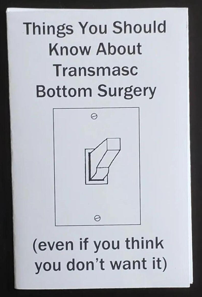 A mini zine with some basic information about FTM/transmasc bottom surgeries, i.e., metoidioplasty and phalloplasty.8-page miniThis zine is free for printing for personal use. You may also print copies to distribute for free at your library, community resource center, etc. (If you do that, I'd love to know about it!) Please inquire beforehand about any other uses.Download the zine here. Print, cut, and fold according to this guide.